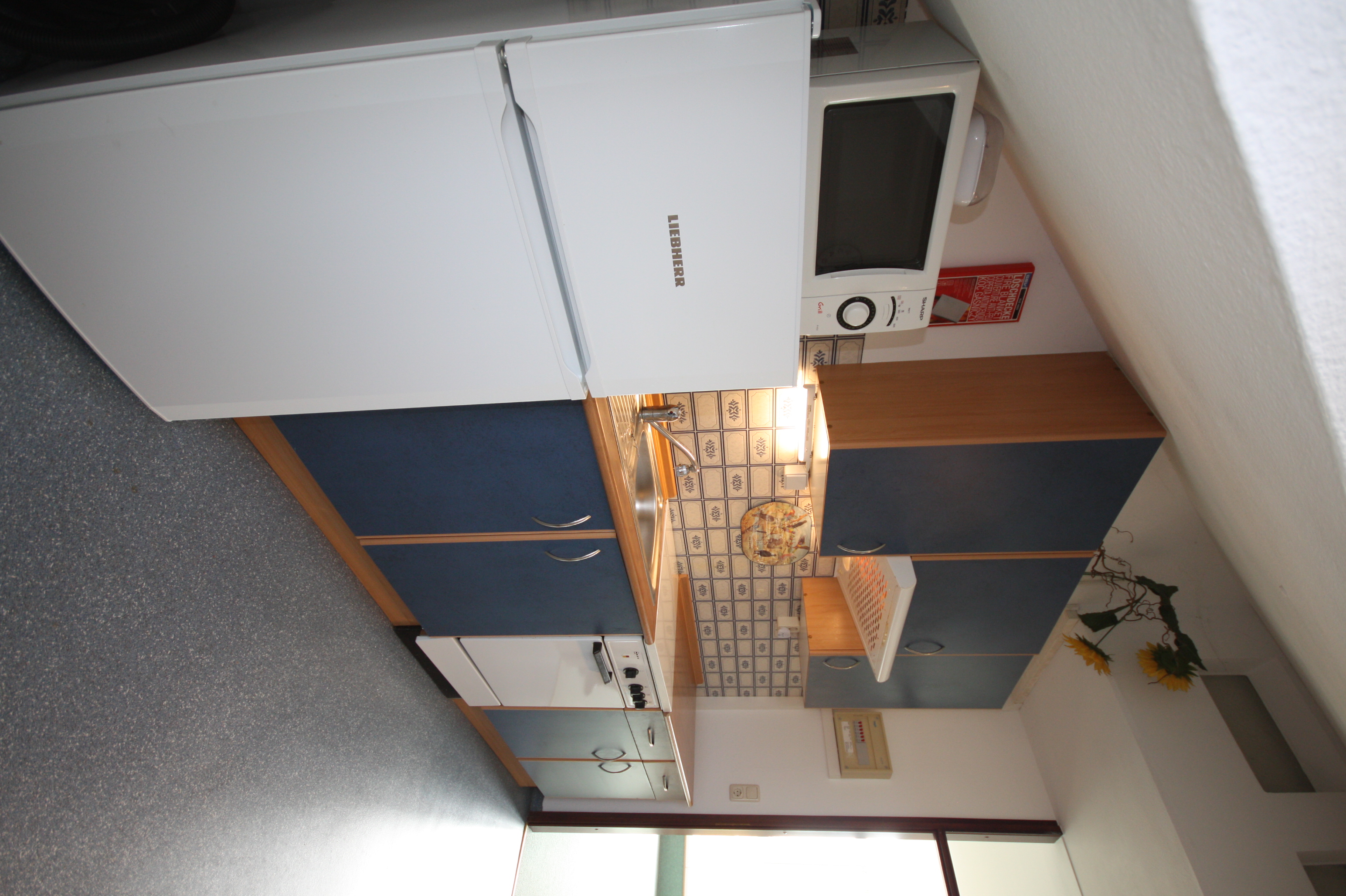 Einbauküche; Kühlschrank|Gefrierfach|Gefrierschrank|Herd|Backofen|Mikrowelle|Kaffeemaschine|Wasserkocher|Toaster|Besteck|Geschirr|Töpfe|Pfannen|Esstisch|Küchenfenster; Staubsauger, Bügeleisen + Bügelbrett